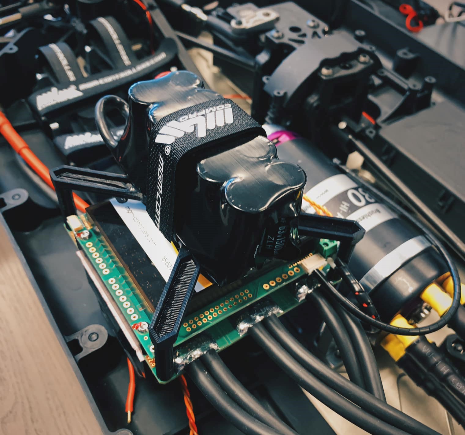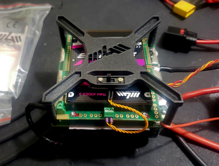 3D printed capacitors holder developed by MGM CONTROLLERS for TMM 40063-3 X2-SERIES. Used to easily attach external capacitors pack and ESC ON/OFF Switch. Our .STL files are also available so you can print it yourself at home - DOWNLOAD HERE